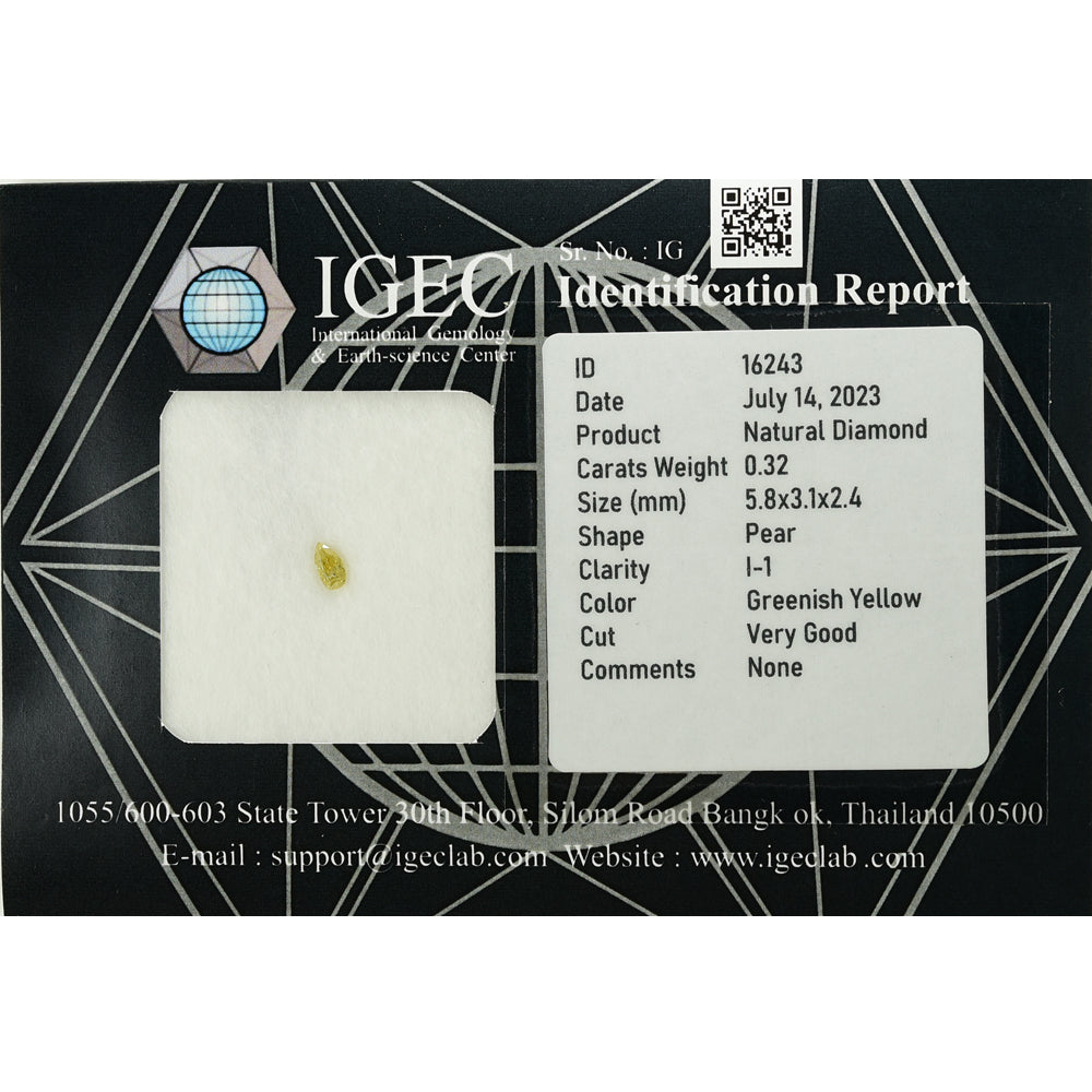 IGEC Certified 0.32cts Greenish Yellow Pear Natural Loose Diamond "SEE VIDEO" 16243